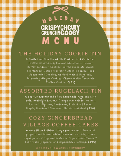 Crispy Chewy Crunchy Gooey is a Philadelphia microbakery specializing in small-batch cookies with bold, nostalgic flavors and modern textures. Every drop features four distinct moods (crispy, chewy, crunchy, and gooey) reimagined through seasonal themes and our original chocolate-chip lineup.